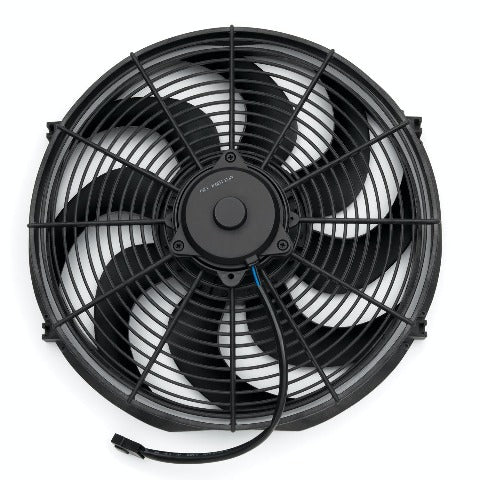 Electric Radiator Fan Kit; High Performance S-Blade Model; 16 Inch Diameter; 2000 RPM and 2100CFM Rating; 9 Amp Draw; Uses a 30 Amp Fuse; Measures 16.5in. Wide X 16.75in. High X 4in. Thick; Nylon Tie Mounting Kit Included