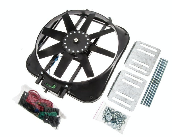 Electric Radiator Fan Kit; S-Blade; High Performance Universal Model; 15 Inch Diameter; 2800CFM Rating; Includes Thermostat; 14 Amp Draw; Measures 16.5in. Wide X 18.5in. High X 4.25in. Thick; Mounting Kit and Hardware Included