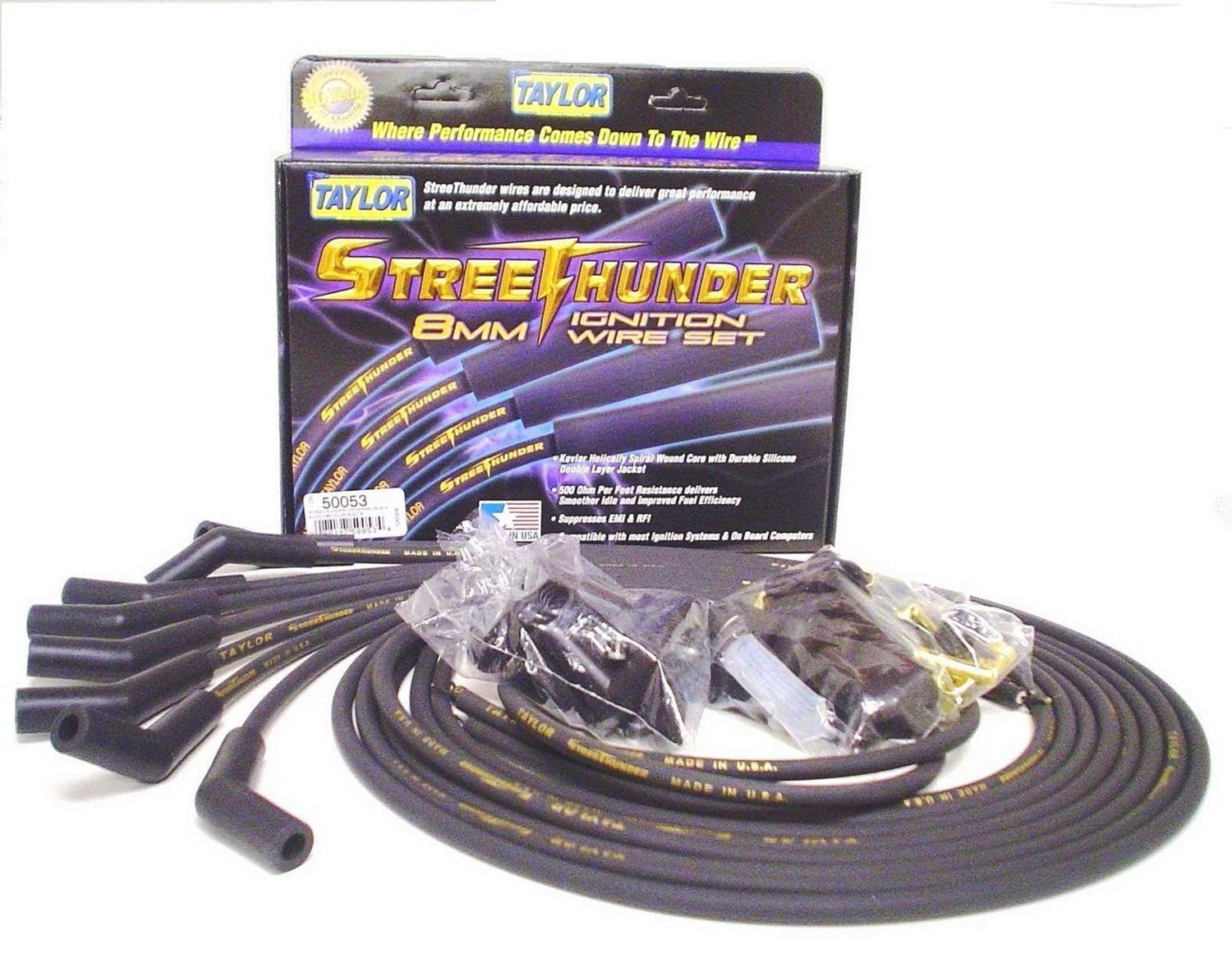 Taylor's 8mm StreeThunder Wire delivers great performance at an extremely affordable price. It features a 500-Ohm per foot resistance Kevlar helically Spiro wound core conductor for greater strength and durability that suppresses Electro Magnetic (EMI) and Radio Frequency Interference (RFI). Wrapped in durable Synthetic silicone double layer jacketing that resists heat, oil and abrasion. Delivers greater spark energy while improving power, idle and fuel efficiency. Works in conjunction with most ignition systems, on board computers and electronic components. Matching black silicone boots protect against high exhaust temperatures. Double locking spring terminals for secure vibration proof connections.