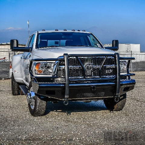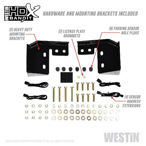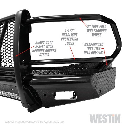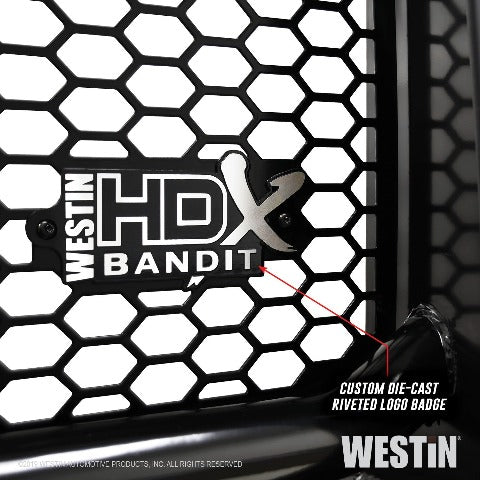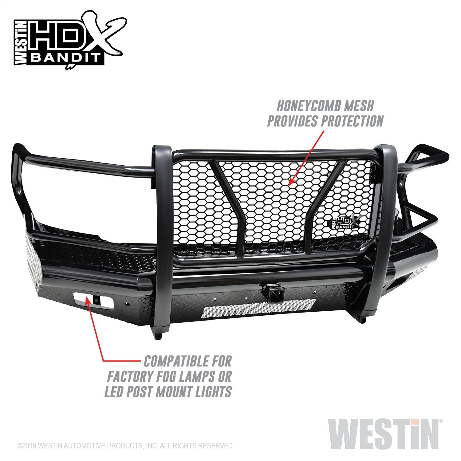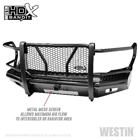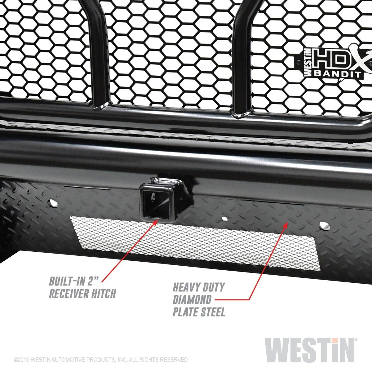Westins HDX Bandit Bumper combines a heavy duty diamond plate steel bumper constructed of schedule 40 steel pipe with a stylish grille guard featuring 2" diameter outer wraparound wings and 2 3/4" wide upright rubber strips. Designed to protect headlights, grille, hood and front fenders from road hazards, debris and wildlife damage. Features a stylish metal honeycomb mesh screen, which allows maximum airflow to the intercooler or radiator area while accenting the front end styling with a clean and rugged look. Removable mesh screens allow for factory camera and adaptive cruise control options available on some late model Ford applications. HDX Bandit Bumper includes a built-in 2" receiver hitch and (2) heavy duty 9,500 lbs bow shackle mounts, capable of delivering multiple towing options. Compatible for factory fog lamps or LED post mount lights. In addition, some late model Ram and Chevrolet applications feature provisions for factory parking sensors. Bolt-on installation with hardware and mounting brackets included. Available in black powder coat finish.