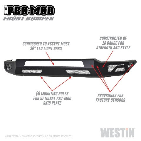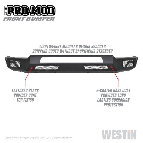 Westins Pro-Mod Front Bumper combines enhanced vehicle protection, with great looks. Pro-Mods revolutionary lightweight modular design is uniquely engineered with outrigger reinforcement brackets to provide maximum front end protection without compromising on strength, integrity or durability. The "high and tight" bumper profile creates a greater approach angle, which significantly improves off-road driving capabilities. The lightweight design also requires smaller shipping packages which dramatically reduces shipping costs. Pro-Mod bumpers feature a textured black finish with an e-coated base coat, providing long lasting corrosion protection from the elements. Once you see the Pro-Mod Front Bumper, the choice becomes obvious.