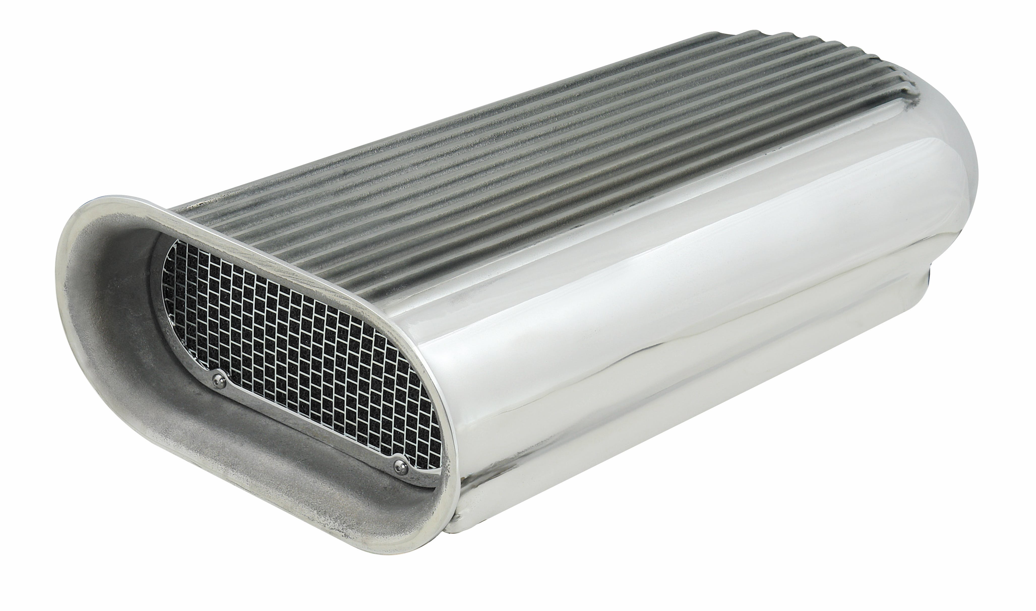 These authentically styled air scoops are made from high quality aluminum castings and are available to fit single and dual carburetor applications using carburetors with 5 1/8 inch diameter necks. The dual carburetor scoop features an adjustable base to fit carburetor's with 7 5/8 inch to 9 1/4 inch center line spacing. Beautifully polished to a high luster, these scoops come with a chrome plated inlet screen and bezel and are complete with all necessary mounting hardware. Use replaceable paper filter elements.
