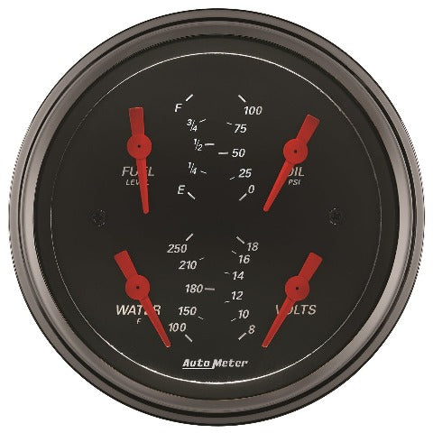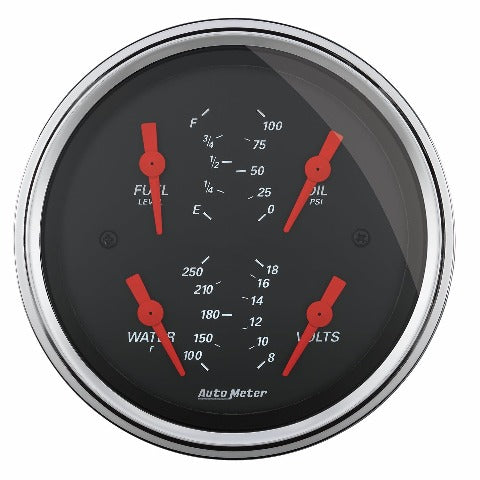 Sometimes space is limited. The AutoMeter Quad Gauge provides a solution to limited dashboard space while providing a clean look. Individual AutoMeter air core meter movements for each function provide the accuracy and durability required by even the most demanding applications. Includes a single wire 1/8 NPT temperature sender and a 1/8 NPT oil pressure sender. The voltmeter reads from 8-18v on negative ground electrical systems and fuel level resistance range is 0 ohms empty to 90 ohms full (compatible with Amid 60's through mid 90's GM fuel level senders).
