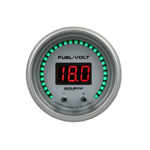 Sometimes the amount of data you want to see and the amount of space you have to display it arent always compatible. New Elite Digital gauges from AutoMeter provide you with options to help optimize your instrumentation without compromising on critical performance data that you need to keep your vehicle operating at its best. This combination Fuel Level and Voltmeter gauge allows you to monitor both critical functions within a single 2 1/16 gauge which is matched to coordinate with popular AutoMeter designs. Featuring a bright LED seven segment display and 30 radial LED indicators, this digital instrument provides you with the ability to toggle between various display views in order to see each channel individually or a combination of the two such as Fuel Level displayed on the radial band and voltage reading out as a digital number in the center of the gauge. Custom alarm points can also be programmed for each channel which can be used to trigger outputs to activate other devices such as lights or buzzers, as well as causing the onscreen gauge display to blink in order to draw the drivers attention to critical readings. Low peak voltage memory recall and programmable fuel level scaling to match nearly all automotive sensor types round out the key features of this product.