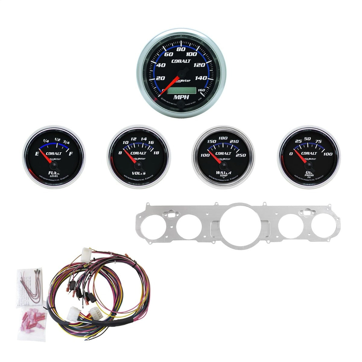 Upgrade your classic Ford Mustang with an AutoMeter direct-fit Cobalt dash kit. This easy-to-install package includes a machined billet aluminum locator plate which nests 5 iconic Cobalt series gauges features matte black dials with blue accents, contemporary performance artwork, high contrast orange needles, flat lenses and bright anodized polished aluminum bezels in the factory openings of your original dash bezel. Blue LED through dial lighting ensures optimal visibility during low-light conditions while our easy, no fab installation allows you to preserve the original interior of your classic ride.