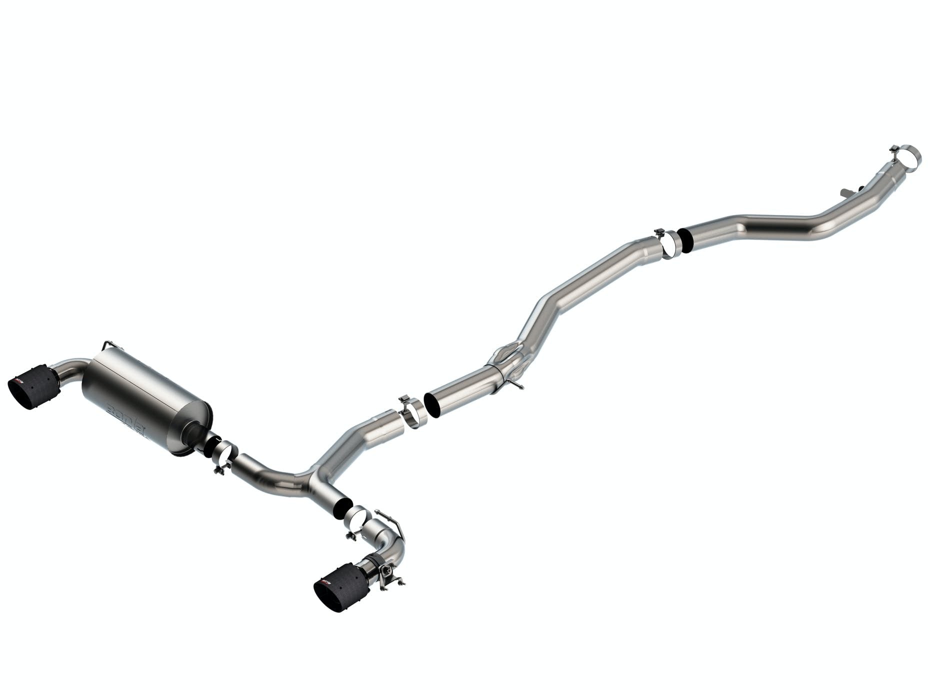 The Borla(r) ATAK(r) system 140826CFBA, is specifically tuned for performance and sound on the Supra's 3.0L twin-scroll turbocharged inline six engine. Our system is designed to be drone-free so you can get the head-turning sound of the ATAK(r) and still enjoy a comfortable cabin during cruise. This Cat-Back(tm) features a 3.5" pipe diameter that splits into dual 3" and comes with 4.5" Carbon Fiber tips to complete the look of the exhaust. It includes our Polyphonic Harmonizer technology and has a functioning valve that works with the factory actuator to change the exhaust volume. As with all Borla(r) products, it is constructed using T-304 stainless steel for increased durability and is backed by our Million Mile Warranty. Bolt-on a Borla(r) and give your Supra the sound it deserves., , System Features:, , Cat-Back(tm) Exhaust System, 3.5" To Dual 3" Pipe Diameter, 4.5" Diameter Carobn Fiber Tips With Black Anodized Centers, Polyphonic Harmonizer Technology, Valved System (retains facotry exhaust modes), T-304 Stainless Steel, No-Drone, Million Mile Warranty, , Each BORLA(r) Exhaust System is built from premium T-304 series stainless steel to give you the absolute best in performance and durability. We strive to provide you with the best quality products and stand behind our systems with a Million-Mile Warranty.