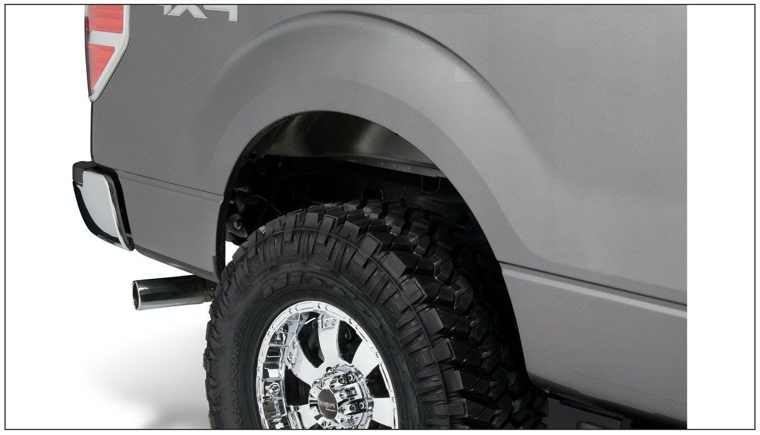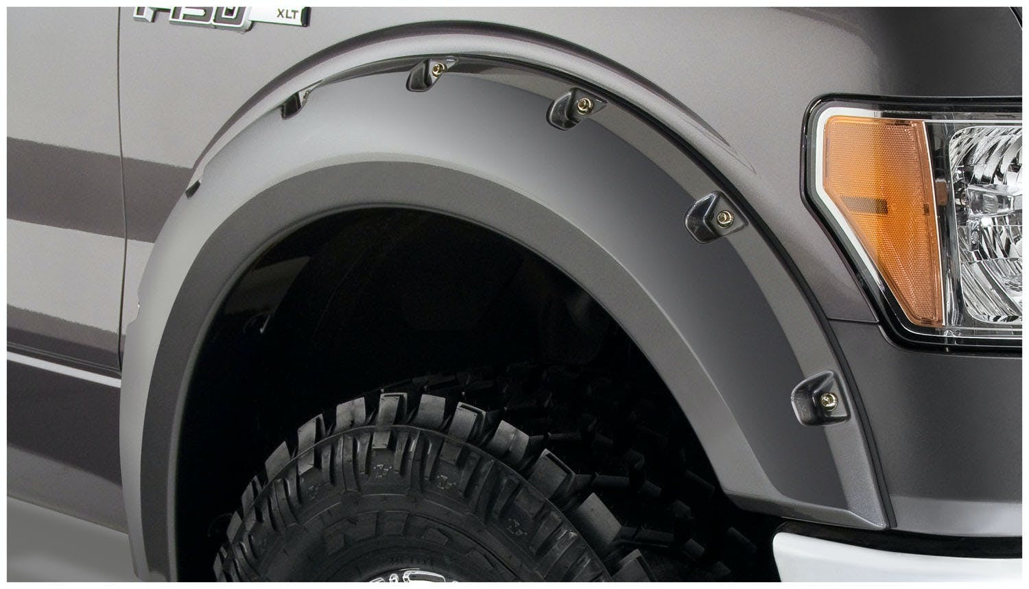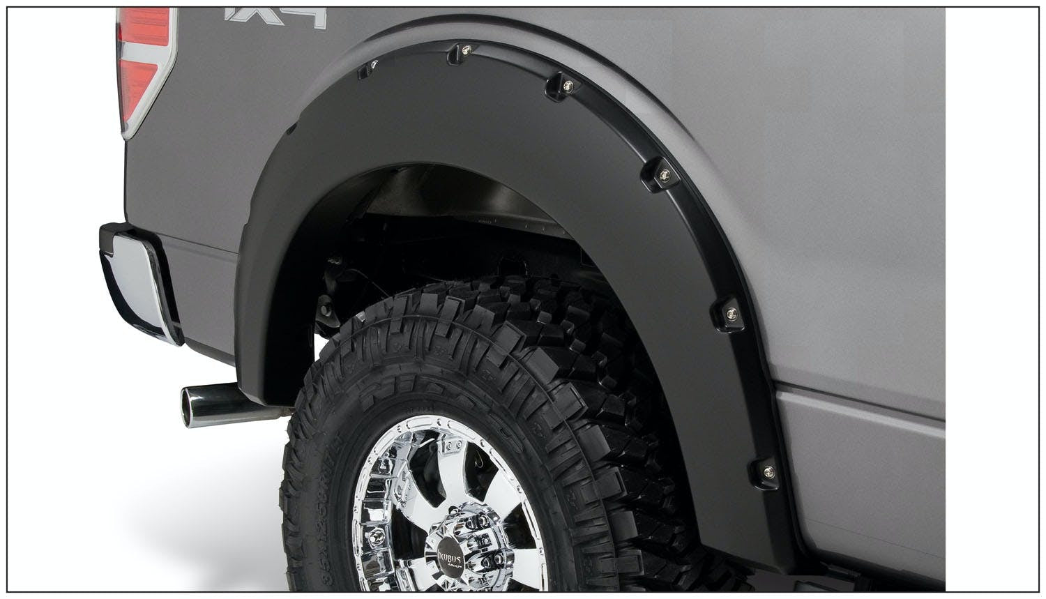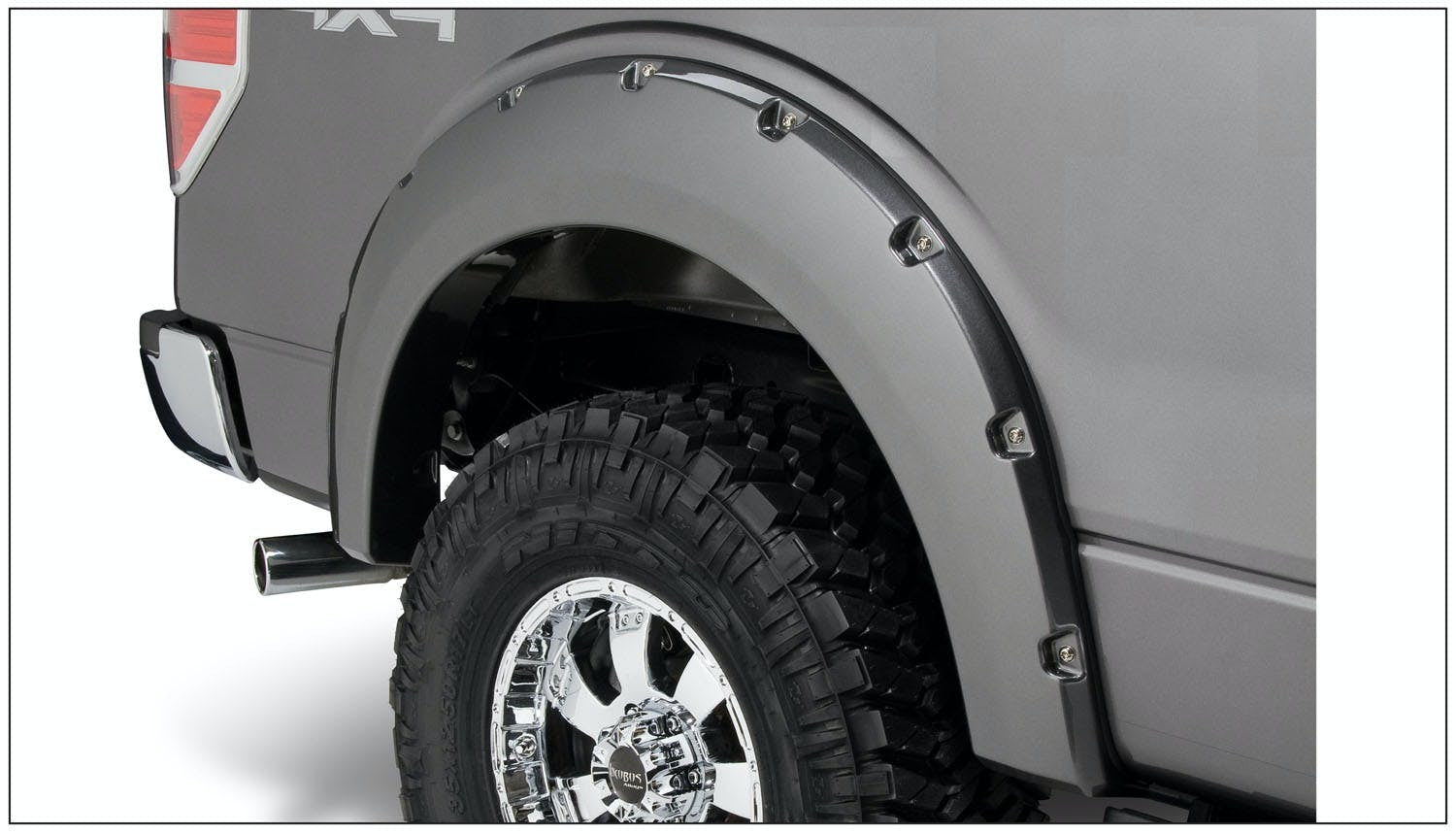 With their recessed stainless steel bolts and massive presence, Pocket Style Fender Flares are a Bushwacker original and an off-road icon. They give you the hard-core look of bolt-on flares, with no body-side sheet metal drilling required. Pocket Style Fender Flares are custom-designed for your vehicle to complement oversized tires and high-clearance lift kits. You can mount them right out of the box with their tough, OEM-style matte black finish they're UV protected so they won't chalk. You can also paint them to match or accent the body color for a factory-custom look. Pocket Style Fender Flares are made from our thick, warp-resistant Dura-Flex 2000 material and tailor-made for added durability and flexibility on the trail. When you need maximum tire coverage with minimum time and effort, it's in the pocket. Pocket Style Fender Flares from Bushwacker.
