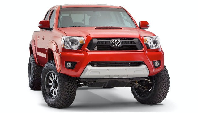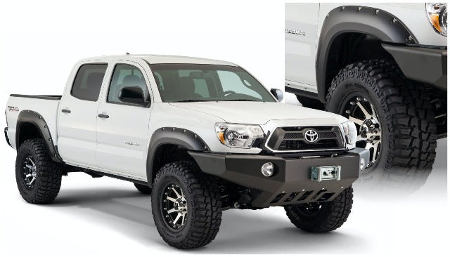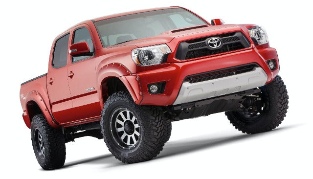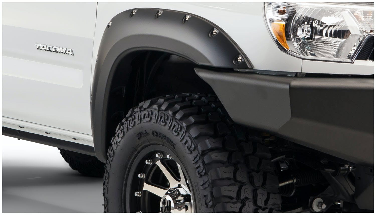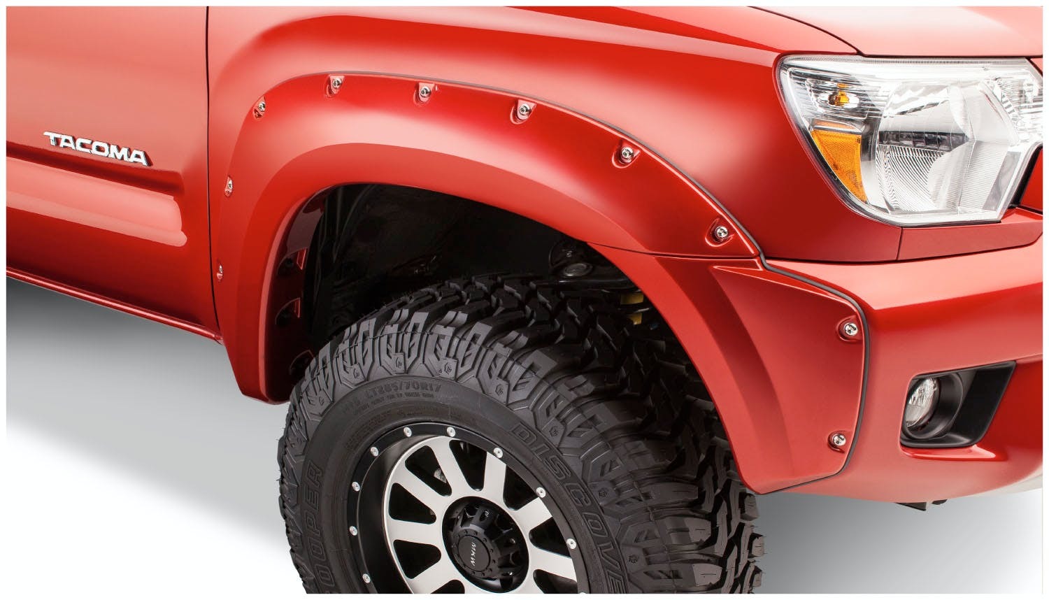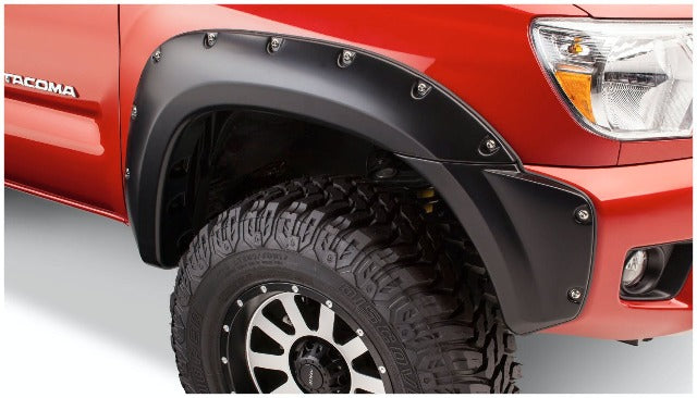 With their recessed stainless steel bolts and massive presence, Pocket Style Fender Flares are a Bushwacker original and an off-road icon. They give you the hard-core look of bolt-on flares, with no body-side sheet metal drilling required. Pocket Style Fender Flares are custom-designed for your vehicle to complement oversized tires and high-clearance lift kits. You can mount them right out of the box with their tough, OEM-style matte black finish they're UV protected so they won't chalk. You can also paint them to match or accent the body color for a factory-custom look. Pocket Style Fender Flares are made from our thick, warp-resistant Dura-Flex 2000 material and tailor-made for added durability and flexibility on the trail. When you need maximum tire coverage with minimum time and effort, it's in the pocket. Pocket Style Fender Flares from Bushwacker.
