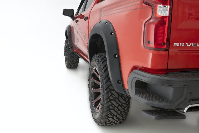 With their recessed stainless steel bolts and massive presence, Pocket Style Fender Flares are a Bushwacker original and an off-road icon. They give you the hard-core look of bolt-on flares, with no body-side sheet metal drilling required. Pocket Style Fender Flares are custom-designed for your vehicle to complement oversized tires and high-clearance lift kits. You can mount them right out of the box with their tough, OEM-style matte black finish they're UV protected so they won't chalk. You can also paint them to match or accent the body color for a factory-custom look. Pocket Style Fender Flares are made from our thick, warp-resistant Dura-Flex 2000 material and tailor-made for added durability and flexibility on the trail. When you need maximum tire coverage with minimum time and effort, it's in the pocket. Pocket Style Fender Flares from Bushwacker.