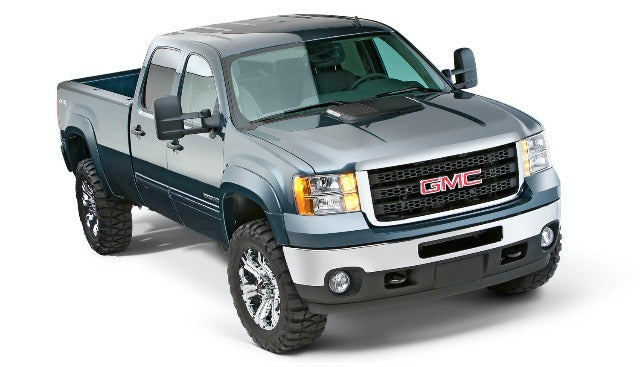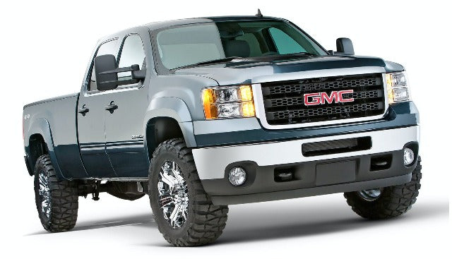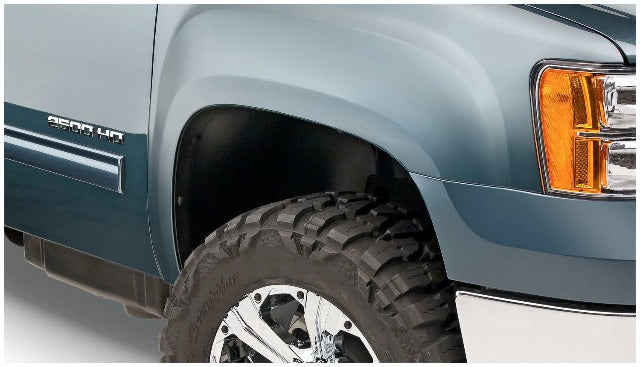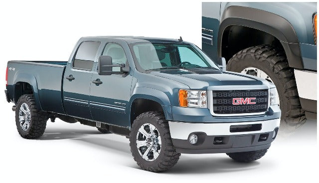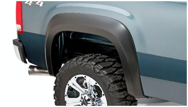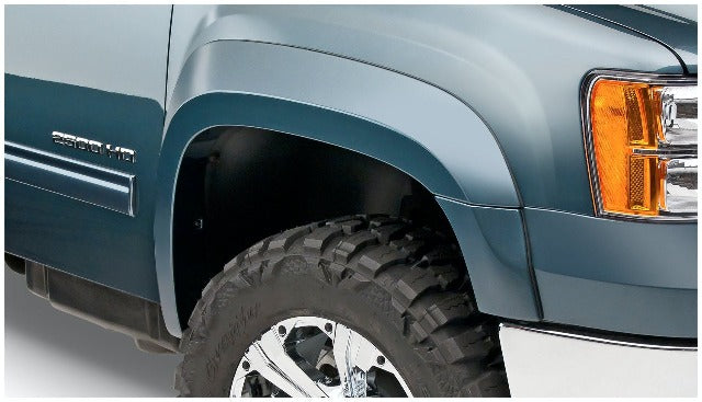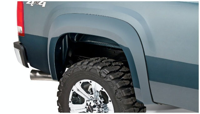 You've equipped your vehicle with oversize wheels and tires for serious off-road traction and clearance. Now you need extra tire coverage to protect your rig's body and maybe even comply with local laws. Bushwacker Extend-A-Fender Flares deliver premium-grade protection and style matched to oversized tires, yet as tough as they are, they go on easily with no drilling required. You can install them in minutes and enjoy them for years. Our exclusive Dura-Flex 2000 material is designed for added durability and flexibility with built-in UV protection. Your Extend-A-Fender Flares resist chalking, cracking, and warping, whether you leave them with their OEM-style matte black finish or paint them for a totally personalized look. Either way, your truck will look factory-equipped for your off-road tires. Extend-A-Fender Flares go on easy, perform tough, and look great.