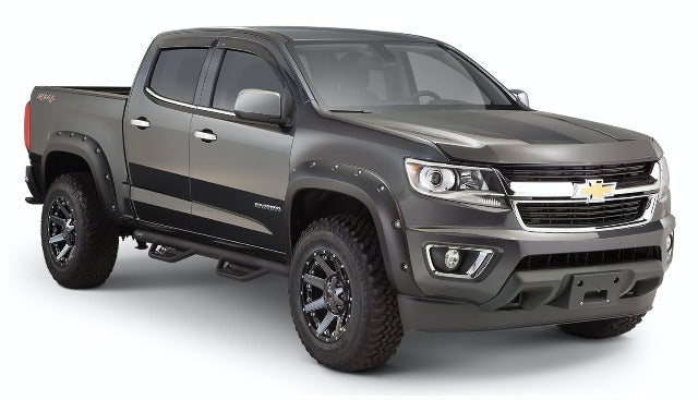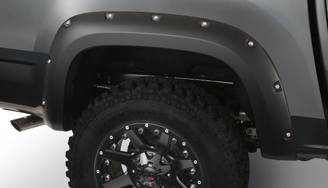 With their recessed stainless steel bolts and massive presence, Pocket Style Fender Flares are a Bushwacker original and an off-road icon. They give you the hard-core look of bolt-on flares, with no body-side sheet metal drilling required. Pocket Style Fender Flares are custom-designed for your vehicle to complement oversized tires and high-clearance lift kits. You can mount them right out of the box with their tough, OEM-style matte black finish they're UV protected so they won't chalk. You can also paint them to match or accent the body color for a factory-custom look. Pocket Style Fender Flares are made from our thick, warp-resistant Dura-Flex 2000 material and tailor-made for added durability and flexibility on the trail. When you need maximum tire coverage with minimum time and effort, it's in the pocket. Pocket Style Fender Flares from Bushwacker.