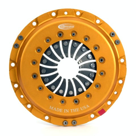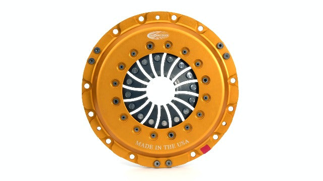 The Centerforce(R) TRIAD XDS 8.75" triple disc clutch has been developed for vehicles requiring a holding capacity of 500 to 1200 ft/lbs of torque at the crank. The billet pressure plate features our patented centrifugal weight system (where applicable) for superior clamp load over stock and our patented ball bearing actuated pressure plate (where applicable) providing light pedal effort. The solid hub (possible gear noise) disc pack is equipped with Kevlar full facing friction material providing increased holding capacity. TRIAD XDS clutches are equipped with a lightened billet steel flywheel providing low inertia resulting in quicker RPM's. Due to the aggressive nature of this race inspired clutch, vehicles may experience some floater noise and/or chatter during operation. Components are designed, machined and assembled in the USA. TRIAD XDS clutches are match balanced and ready for installation using the included ARP fasteners.