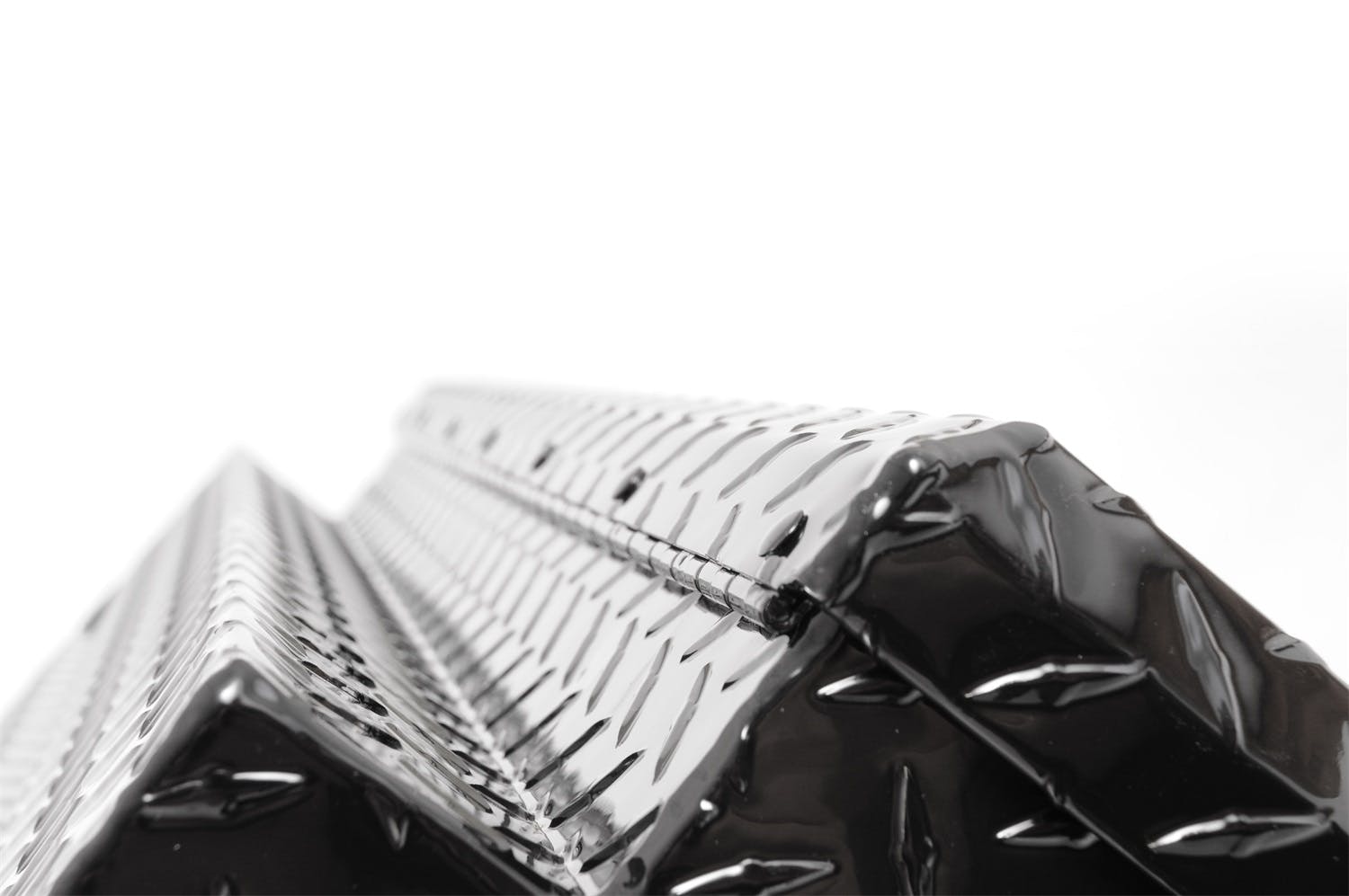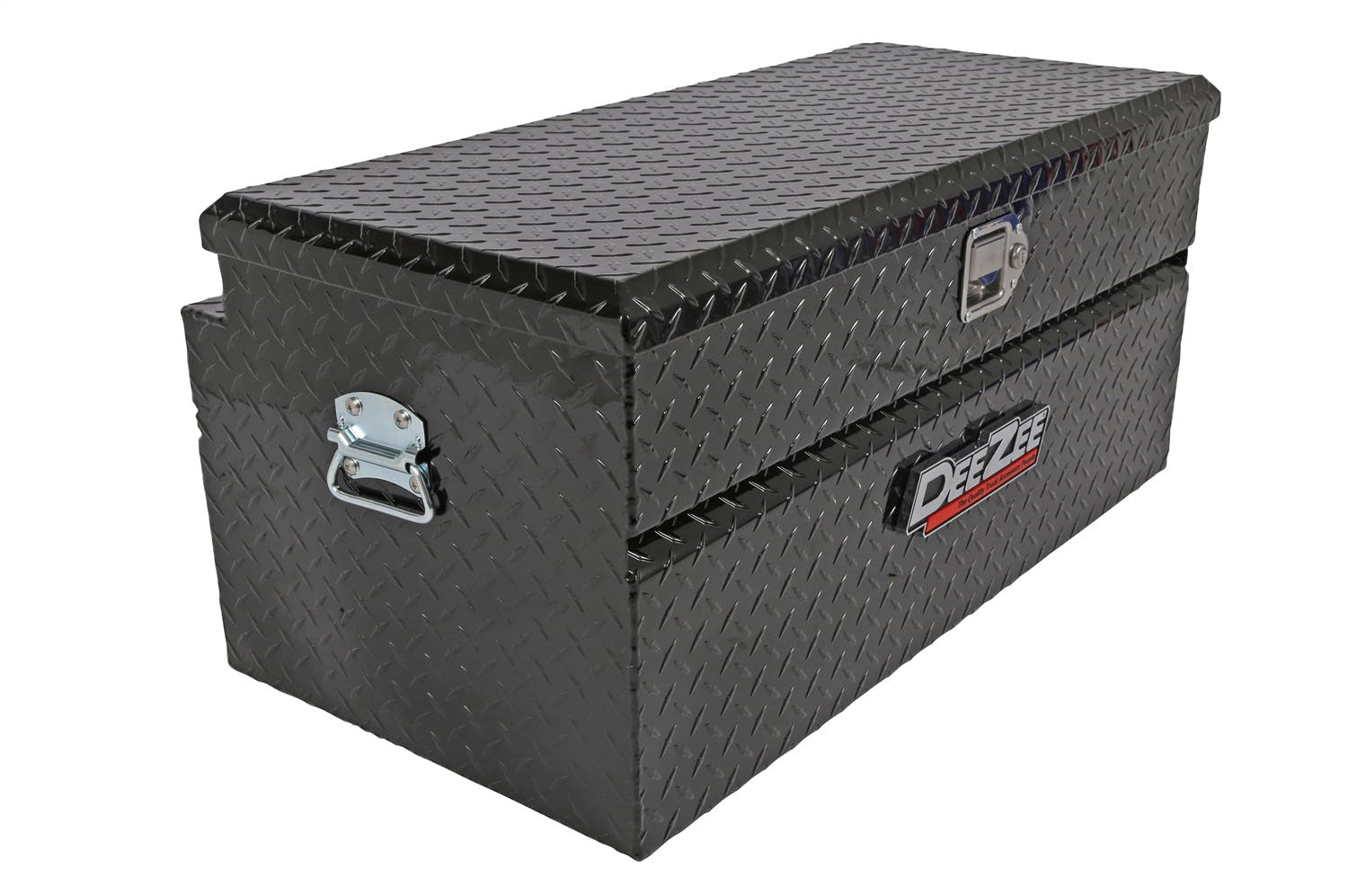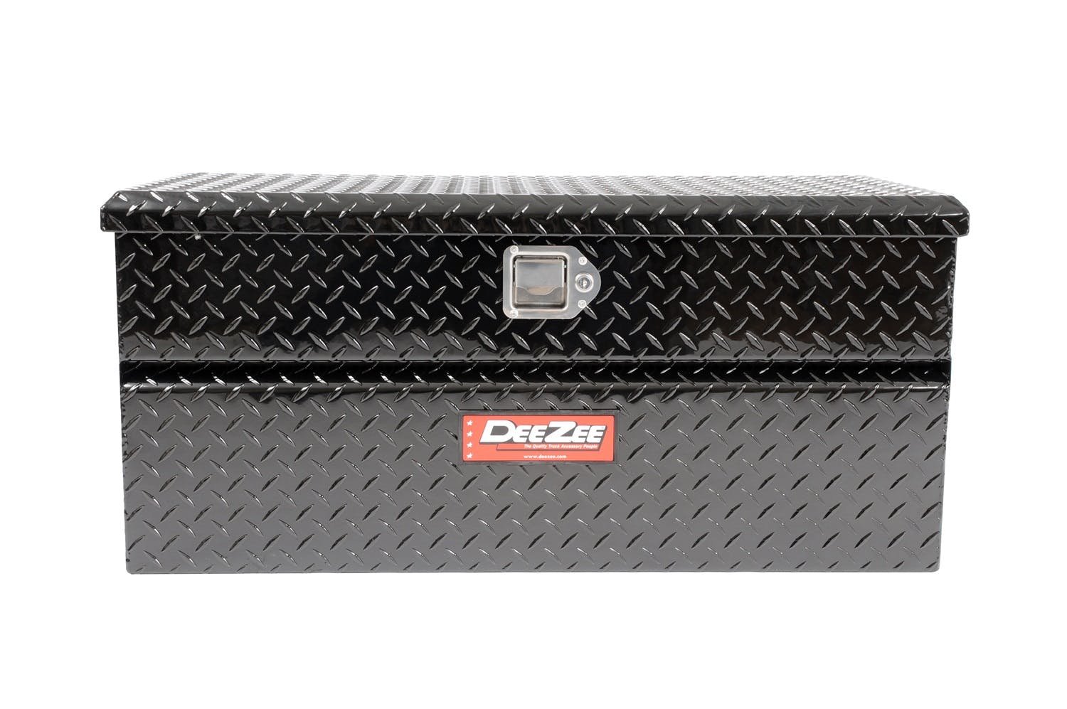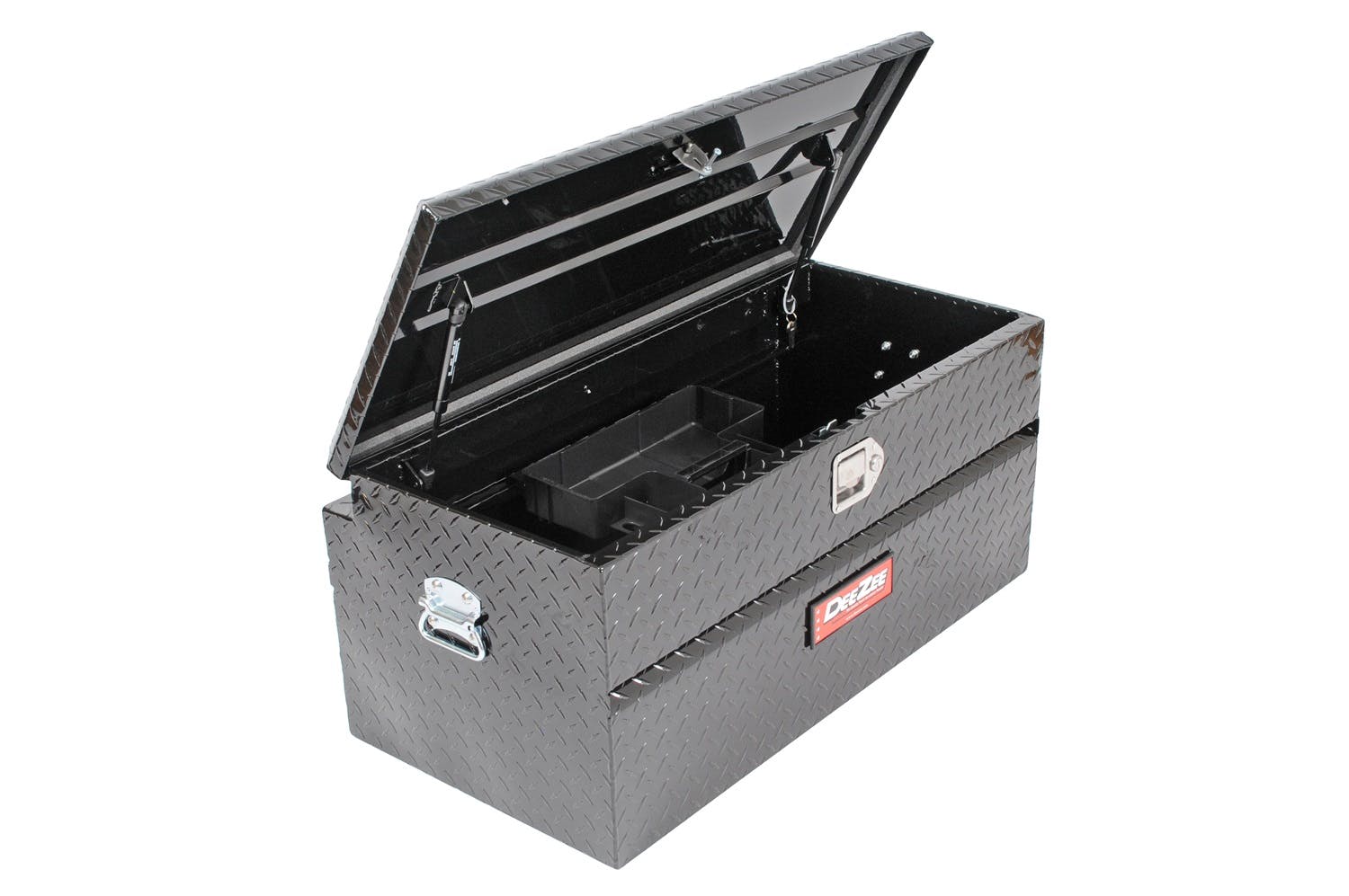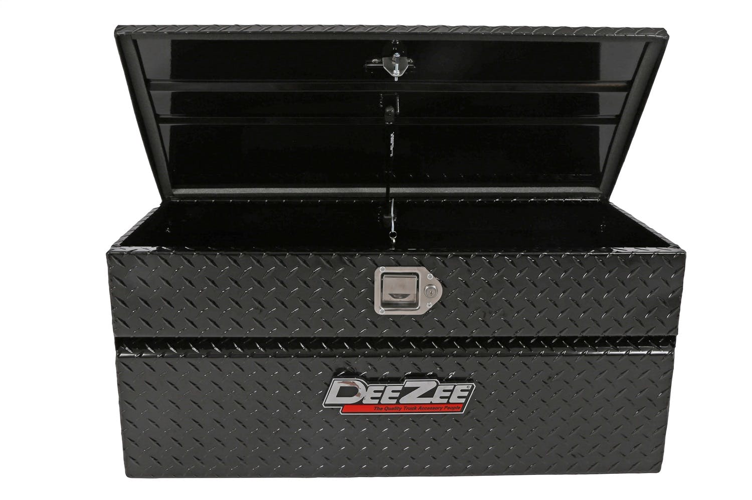 Dee Zee Tool Box - Red Label Chest. Constructed of heavy duty Brite-Tread aluminum. Black-Tread powder coat, provides a gloss black finish while it protects and prevents oxidation. Crown style lid with a full pan double-V stiffener for superior rigidity. Other features: lockable stainless steel paddle handles, dampened gas shocks, closed cell foam gasket, and self-adjusting strikers. Removable plastic tool tray to help keep small items organized.