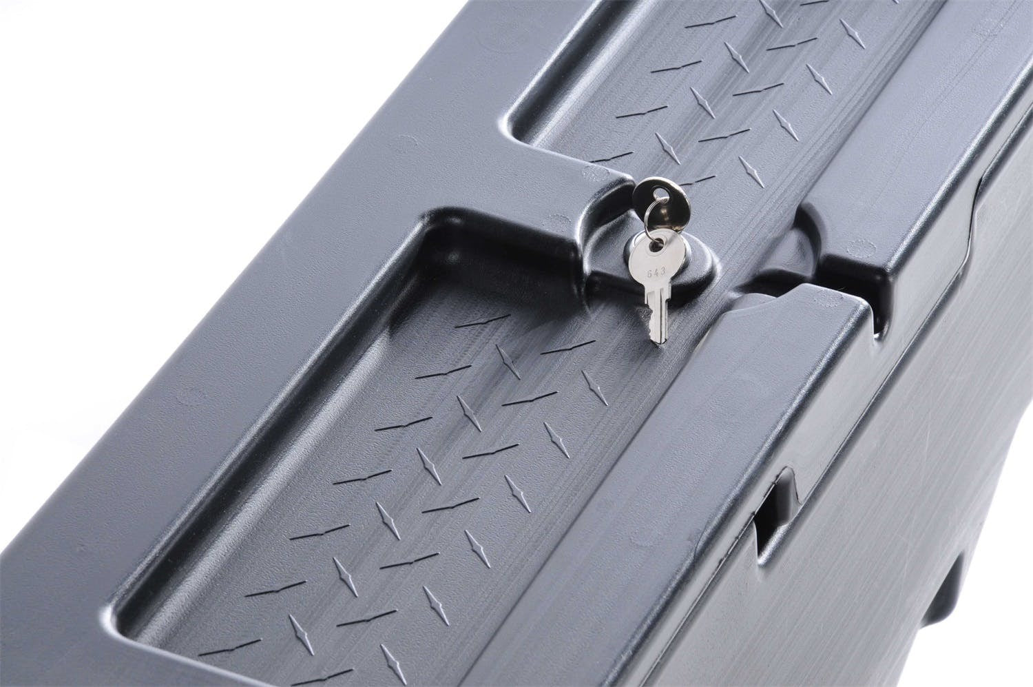 Specialty Series Wheel Well Tool Box; Volume 2.2 cu. ft.; L 37 in. x W 7.75 in. x H 19.5 in.; Reversible Lid; Poly;
