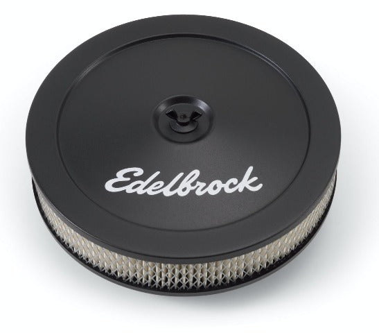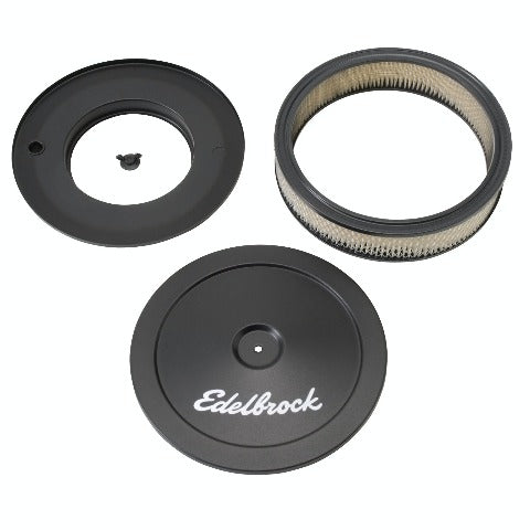 Edelbrock triple chrome-plated round air cleaner #1203 work with all popular 5-1/8" diameter carburetors (Performer Series, Thunder Series AVS, Holley, Thermo-Quad, Quadra jet and Carter AFB). The 10" and 14" models have knock-outs in the air cleaner base for use with Edelbrock crank case ventilation adapter #1205 (sold separately). #1208, #1209 and #1221 fit all Edelbrock carburetors. Heights of air cleaners are in parentheses, measured from the gasket flange to the top of the supplied retaining nut. Dimensions are accurate within 1/8".