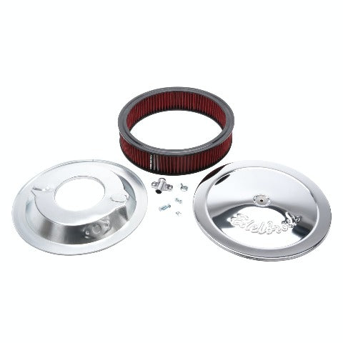 Edelbrock triple chrome-plated round air cleaner #1224 works with all popular 5-1/8" diameter carburetors (Performer Series, Thunder Series AVS, Holley, Thermo-Quad, Quadra jet and Carter AFB). The 10" and 14" models have knock-outs in the air cleaner base for use with Edelbrock crank case ventilation adapter #1205 (sold separately). #1208, #1209 and #1221 fit all Edelbrock carburetors. Heights of air cleaners are in parentheses, measured from the gasket flange to the top of the supplied retaining nut. Dimensions are accurate within 1/8".