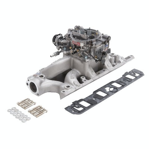Edelbrock Single-Quad Manifold and carb kit for 1957-86 Small-Block Chevy. With a Manifold and Carb Kit, it's easy to upgrade your induction system with the best combination of Edelbrock proven performance and looks in a single box.