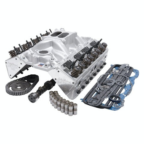 Edelbrock part #2038 E-Street EFI Top End Kit is designed for 1957-86 Small-Block Chevy V-8 engines. This Top End Kit produced 338 HP & 389 TQ on a 350 c.i.d. Small-Block Chevy with 9.0:1 compression. The kit delivers entry-level affordable street performance and great drivability from idle to 5,500 rpm. This kit includes a Performer EPS intake manifold, E-Street cylinder heads, Performer hydraulic flat tappet camshaft, pushrods, timing chain, complete bolt kit and an Edelbrock gasket set. To get great performance out of any engine, all of the components must work together. For over 30 years, the Edelbrock Total Power Package system has solved the parts matching puzzle for many street performance enthusiasts. With the introduction our Power Package Top End Kits, now you can get the best Edelbrock performance in-one-box, under one part number with "no guesswork" involved.
