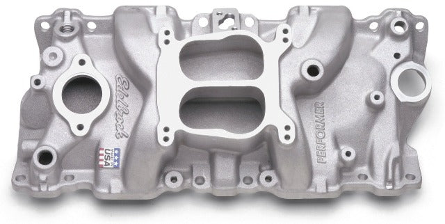 Edelbrock Performer Intake Manifold For Chevrolet 262-400 Small-Block V8 is Designed for Street Applications with 1987-95 Cast Iron Heads & Canted Center Bolt holes. Accepts (4150-Style) Edelbrock or Q-Jet Carburetors. Non-EGR
