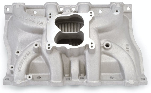 Edelbrock part #2115 Performer Cadillac intake manifold is designed for 1968-76 Cadillac 472 and 500 cubic-inch engines. For either square or spread-bore carbs, this is the first intake designed specifically for high-performance Cadillacs using standard heads. Like all Edelbrock Performers, this manifold increases torque and horsepower from idle to 5500 rpm. The broad power band is ideal for high-performance's street and engine swap applications. Specs on this non-EGR manifold include a carb pad height that's 3" taller than stock. Dropped divider wall evens air/fuel ratio throughout the rpm range. Stock air conditioning compressor will not fit.