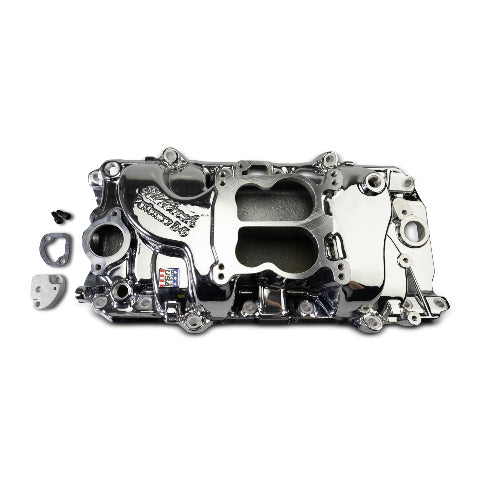 Edelbrock part #2161-CP Performer 2-O intake manifold is designed for street 396-502 c.i.d. big-block Chevy V8's using general duty oval-port cylinder heads. The PN 2161-CP version comes with a brilliant Chrome plasma finish that is durable and easy to maintain.Will not fit under hood of Corvette without hood modifications. Will not fit "tall block" V8's. May be used with OEM or aftermarket carbs. Will fit 1965-90 oval port heads. Edelbrock's Patented Dual-plane low-rise design with a 180-degree firing order greatly improves torque over a wide rpm range for excellent throttle response from off-idle through 5500rpm. This Performer intake manifold is ideal for passenger cars trucks 4x4s tow vehicles and RVs.