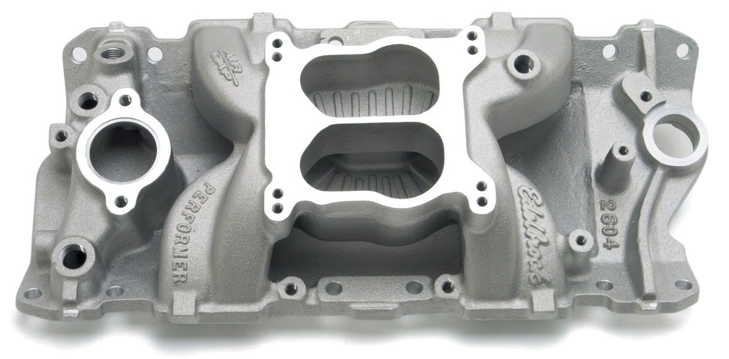 Edelbrock part #2604 Performer Air-Gap intake manifold is designed for 1987-95 cast iron heads with canted center bolt holes small-block Chevys. This design features an open air space that separates the runners from the hot engine oil resulting in a cooler, denser charge for more power. High-velocity runners deliver excellent throttle response throughout the power band. The great looks of the Performer Air-Gap along with the solid idle to 5500 rpm performance makes this an ideal choice for street rods and street machines. Fits spread-bore or square-bore carburetors. Will not fit under stock Corvette hood.