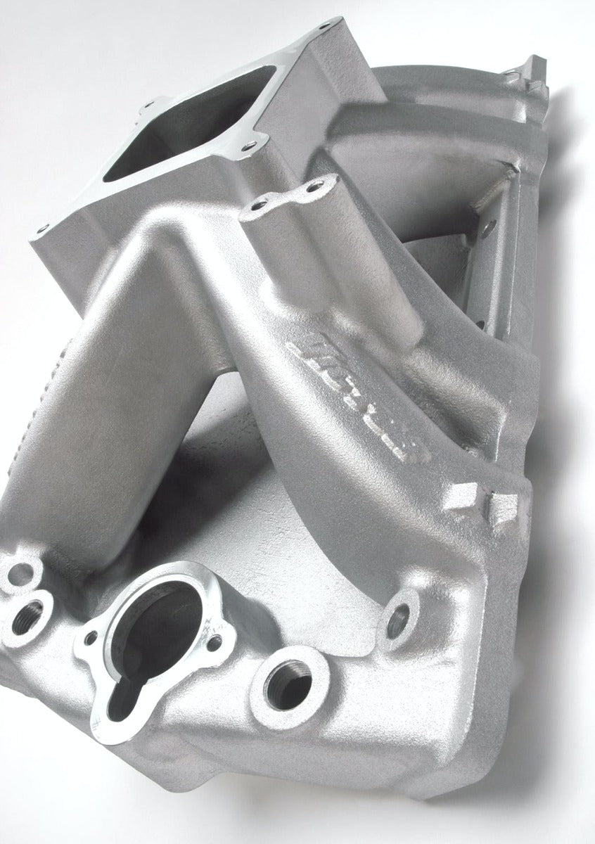 Edelbrock part #2812 Victor Oldsmobile intake manifold provides power levels never before available for competition single-carb 350-403 Olds engines. Featuring a single-plane "Air-Gap" design, it accepts square-bore carb and offers significant horsepower increases over existing intakes in the 4500 to 7500 rpm range. It features a carb mount pad height of 7" and high-flow constant area 3.2-square-inch runners. The runners have been optimized to match the flow characteristics of Edelbrock Performer RPM aluminum cylinder heads #60519 and the exit size, as-cast, is 1.28" by 1.94" with plenty of metal thickness for gasket matching and porting.