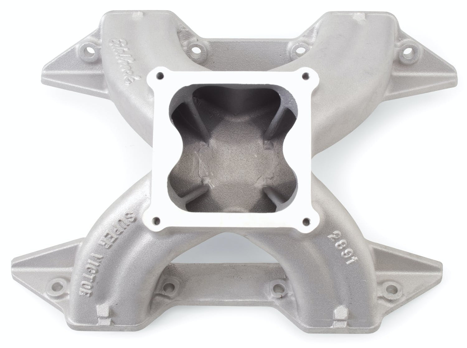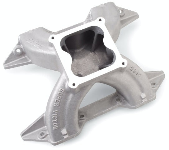 Edelbrock part #2893 Super Victor 440 Max Wedge intake manifold is designed for 413-440-500+ RB with Max Wedge heads and 4500 Series carburetors. This intake manifold is designed to fit 1962-64 Max Wedge heads or the Edelbrock Victor Max Wedge cylinder heads #77939 and #77949 for maximum performance. For competition and high-rpm Chrysler V8's, the Super Victor 440 has an all-new runner design that delivers maximum power from 3500 to 8000 rpm in drag race applications. The manifold port exits are CNC machined to 1.30" x 2.58". Edelbrock part #7798 valley cover is required when used with Edelbrock Victor Series cylinder heads.
