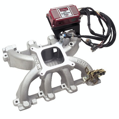 Edelbrock part #2908 Victor Jr. Cathedral Port intake manifold is a low-rise single plane intake capable of supporting up to 600 hp. The Victor Jr. Cathedral Port accepts a square bore carburetor and includes an electronic timing module that picks up MAP, crank position, and cam position in order to drive the stock LS Coil-on-Plug ignition system. It accepts either 24x or 58x input signal. The module offers a choice of 6 built-in timing curves, each tailored for engine displacement, cam profiles, and fuel grades. Can also be tuned using a laptop to control features such as launch and max rev limit, individual cylinder timing, and nitrous retard. The kit includes a throttle bracket designed to work with 700R-4, 200R-4 and Turbo 350 transmissions. Uses stock o-ring gaskets GM PN 12533587. Fittings and mounting bolts included.