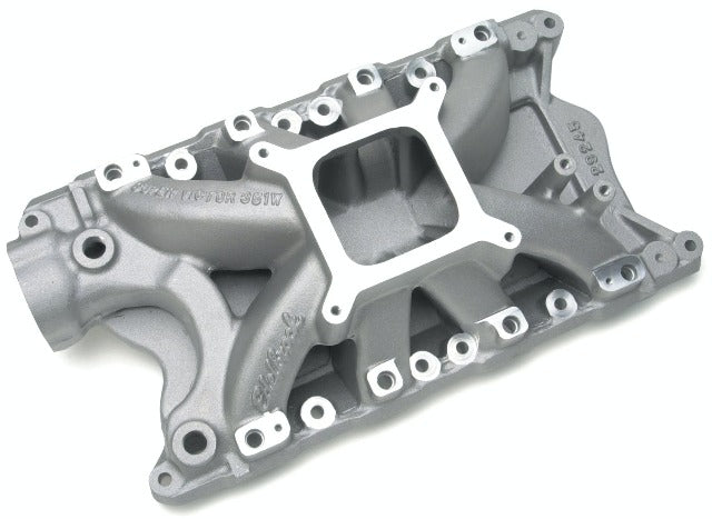 Edelbrock part #29245 Super Victor 351W EFI intake manifold is designed for high rpm or large displacement competition 351 Windsor Ford V8's with a deck height of 9.5". It's ideal for drag racing or oval track engines operating between 4500 and 8500 rpm. This intake manifold can be used with ported factory cast iron heads, however aftermarket aluminum heads are recommended, such as Edelbrock Victor Jr. #77169 or Victor heads #77219 for ultra high-horsepower. Runners have a 3.20 square-inch cross sectional area.