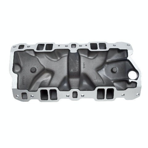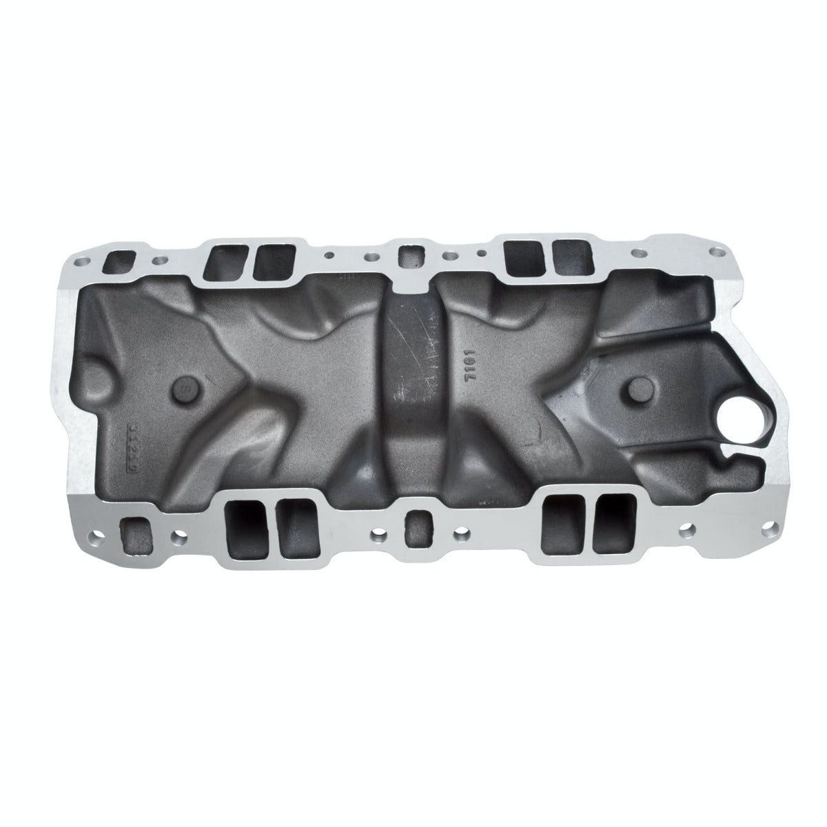 Edelbrock part #71013 Performer RPM intake manifold is designed for 1955-86 262-400 c.i.d. Chevy V8's, for maximum power and a broad torque curve for high-performance street/marine engines. Provides power like a single-plane and throttle response like a dual-plane. Has provisions to machine for an oil fill tube. No provisions for exhaust heated or stock-style choke. Accepts late-model water neck, air-conditioning, alternator and H.E.I. Will fit cast iron Chevrolet Bowtie heads but will not fit 1987 and later cast iron heads. Intake manifolds will not fit under stock Corvette hood. This manifold offers a durable black power coated finish for long lasting protection and a distinctive look.