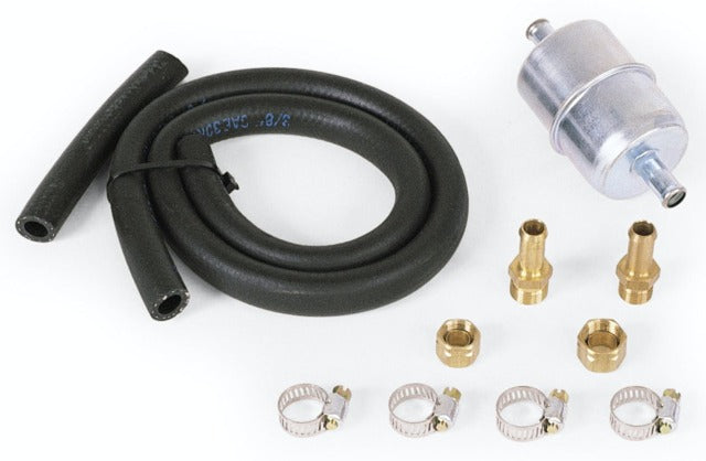 The Edelbrock Universal Fuel Hose & Filter Kit #8135 is designed for quick installation when retaining part of the stock steel fuel line, simply cut the stock line and install the compression fitting. Use supplied neoprene hose, clamp and special fuel filter and connect to carb. Will work with either 5/16" or 3/8" lines. Kit includes fuel filter, special fittings to adapt 5/16" and 3/8" steel line to 3/8" fuel hose, 24" of 3/8" fuel hose (SAE 30R7) and four stainless steel worm-type hose clamps.