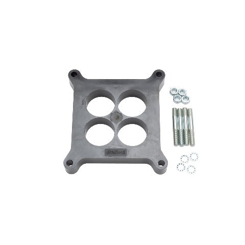 The Edelbrock Carburetor Spacer #8715 divided design is for use with Dual-Plane Design intake manifolds. The Edelbrock #8715 divided spacer is 1/2" thick and made of aluminum.