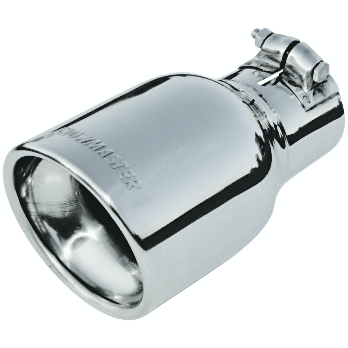 Exhaust tip, logo embossed polished stainless, double wall rolled edge angle cut, 4.00 in. tip diameter x 2.50 in. pipe diameter x 7.50 in. length, clamp on. Sold individually.