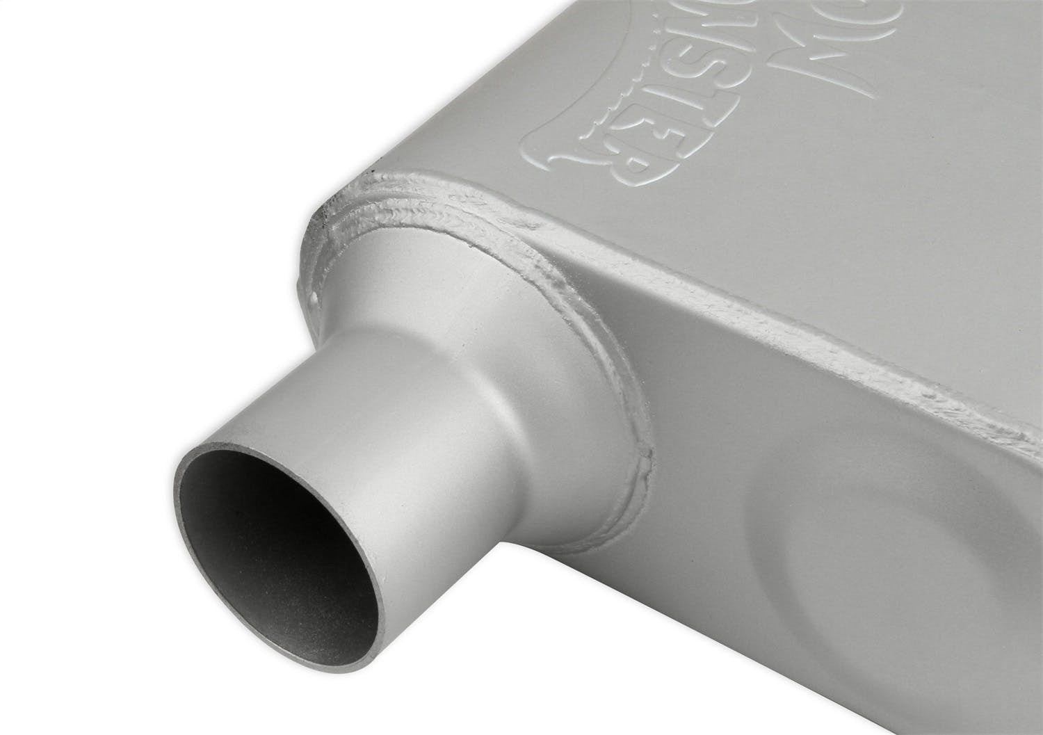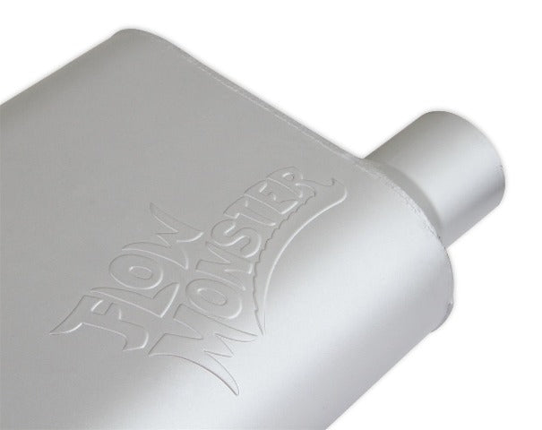 Unleash your Monster with FlowMonster chambered mufflers. Hidden beneath your ride lies a powerful creature destined to dominate. FlowMonster chambered mufflers create an aggressive exhaust note giving a powerful voice to your car/truck/SUV. FlowMonster mufflers are constructed of 16-gauge aluminized steel and are 100% MIG welded for maximum strength and durability. The chambered design cancels out unwanted frequencies with no packing producing an aggressive exhaust note that will not change with time. FlowMonster mufflers are coated with high heat resistant silver paint for an aggressive look under your car. Here the Roar with FlowMonster!
