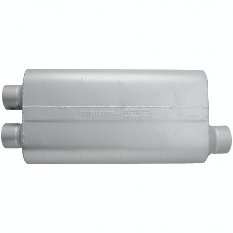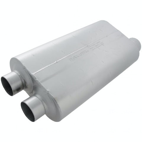 The 50 Series Big Block muffler is made for more than just big cubic inch engine applications. Its large case size with internal tuning chamber provides mileage and power gains along with maximum sound control for a quiet interior tone, even under heavy loads. Well suited to heavy duty vehicles such as full size trucks, SUV's, RVs, and tow vehicles. Constructed of 16 gauge aluminized steel and fully MIG welded for maximum durability.