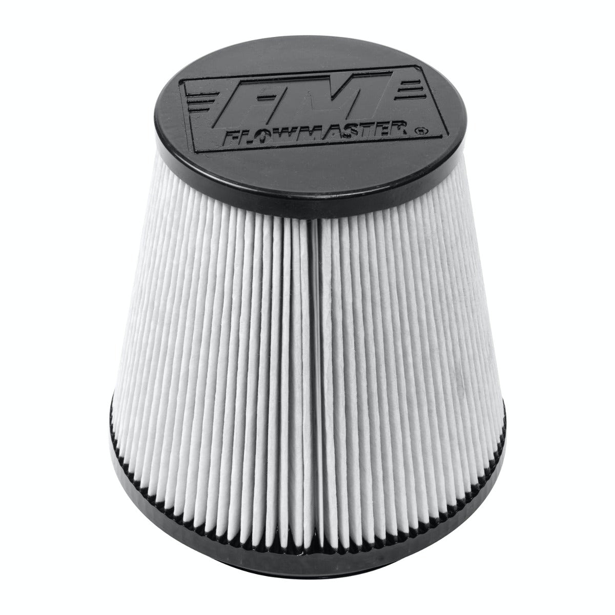 Flowmaster's New Delta Force universal-fit replacement dry synthetic air filter features 0.50 inch deep pleats by 7.50 inch cone length providing an overall wide surface area for optimum airflow. The inlet has a large 6.00 inch opening and the end cap has the Flowmaster logo embossed right into the end showing everyone you appreciate quality and performance. A dry filter is recommended if you drive in a heavy dusty environment and you can extend the usable life of these filters by using lower pressure compressed air to blow the dirt particles off the exterior element.Be sure to check out our pre-oiled cotton replacement filters, which also protect and filter very well in heavy dusty conditions.