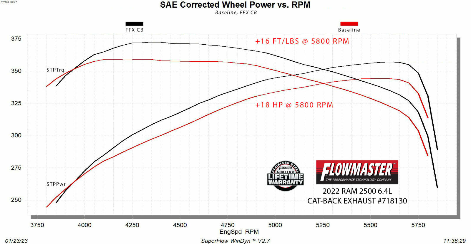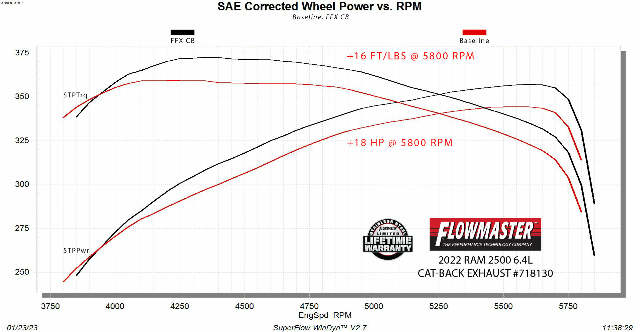 14-23 RAM 2500 6.4L - FLOWFX - CAT-;2014-2023 RAM 2500/3500 trucks with the 6.4-liter HEMI engine.;flowmaster; flowfx; flow; fx; 6.4l; hemi; truck; 2500; 3500; heavy; duty; tow; towing; dodge;;Flowmaster FlowFX Cat-Back Exhaust System;Fits 2014-2023 RAM 2500/3500 6.4-Liter HEMI, Cat-Back, Dual Rear Exit, FlowFX Stainless Steel Exhaust System;This Flowmaster® FlowFX® cat-back exhaust system for the 2014-2023 RAM 2500/3500 trucks with the 6.4-liter HEMI engine is manufactured using durable 409 stainless steel throughout and features 3.50 to 3.00-inch mandrel bent pipes for better exhaust gas flow. Maximum increases on the dyno revealed 18 hp and 16 lb-ft of torque at the rear wheels over stock. This system exits with dual 4.00-inch black stainless steel tips for added style and a custom look. The system uses all the existing factory hanger locations and includes installation instructions and all necessary hardware for an easy installation that you can do at home. Backed by Flowmaster's Lifetime Limited Warranty.;3.50-inch to dual 3.00-inch mandrel bent 16-gauge 409 stainless steel tubing maximizes exhaust flow and improves durability;4.00-inch black stainless steel tips add a custom look to the truck;Includes complete hardware and factory styled hangers in the stock locations for an easy installation;FlowFX “Straight Through” muffler delivers an aggressive to moderate sound level with increased performance;Max gains of 18 hp and 16 lb-ft of torque at the rear wheels over stock