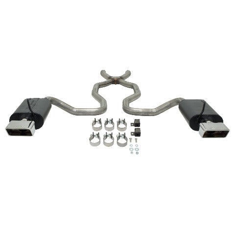 Flowmaster's Force II Cross Member Back system for the 1970-1973 Chevrolet Corvette is perfect for the person looking for a moderate exterior and mild interior exhaust tone, with all of the performance benefits that you would expect from Flowmaster. This bolt-on DOR (Dual Out the Rear) system for the 5.7L V8 features 50 Series Delta Flow mufflers, a Scavenger X-pipe assembly and 2.25 in. tailpipes. Like all Flowmaster systems, the pipes are all mandrel bent to reduce any restrictions and maximize performance. The system finishes with rectangular polished 304S stainless steel tips that exit in the factory cutout bezels. The exhaust system is manufactured out of 409S stainless steel and is covered by Flowmaster's Lifetime Limited Warranty. Designed for an easy fit, this system includes all necessary parts and hardware for installation. Note: Can be used with manifold downpipe kits #81098 (Manual trans.) or #81095 (Auto trans.) to create a complete system.