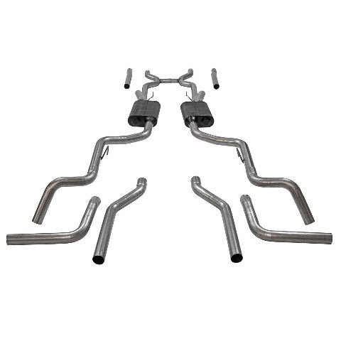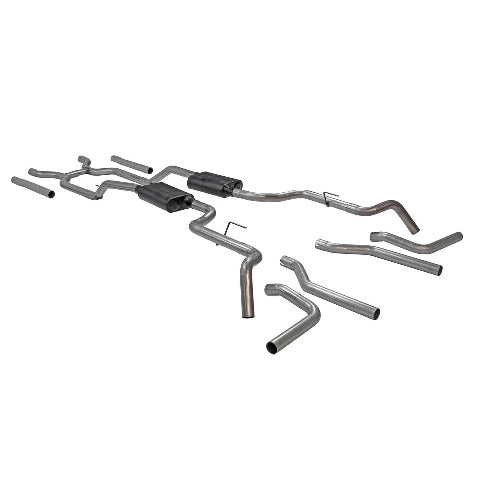 This American Thunder exhaust system is specifically designed for 1963-1966 Chevrolet C10 and GMC 1000 series 2-wheel drive, non X-Frame V8 trucks without the torsion bar front suspension. The system is perfect for the person looking for an aggressive to moderate exterior and interior sound level. Starting just after a set of headers, this exhaust system comes complete with a built-in H-pipe crossover and all mandrel-bent 2.50-inch 409 stainless steel tubing that helps maximize the flow of the exhaust pulses for better performance and the added durability of stainless steel. The Super 44 Series performance mufflers will give any V8 a deep rumble with that classic Flowmaster tone. This system comes with your choice of three tailpipe exits, straight out the rear, side exit behind each rear tire, or dumped behind the rear tires. The system includes all hardware necessary for an at home installation. This exhaust system is covered by our Lifetime Limited Warranty. Fits both short and long wheelbase trucks.