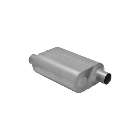 Super 40™ Delta Flow Muffler; 2.5 in. Offset Inlet/Opposite Side Offset Outlet; Case Dimensions 5 in. x 10 in. x 13 in.; 17 in. Overall Length; 409 Stainless Steel;