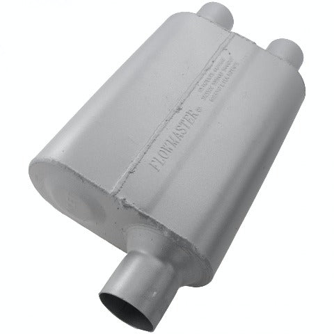 This two chamber design incorporates Flowmaster's patented Delta Flow technology. The Delta deflectors generate increased scavenging for better performance and reduced interior sound. Milder exterior tone and reduced interior resonance over Original 40 series. Constructed of 16 gauge aluminized steel and fully MIG welded for maximum durability.
