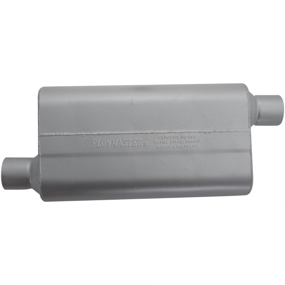 50 Series™ Delta Flow Muffler; 2.5 in. Offset Inlet/Opposite Side Offset Outlet; Case Dimensions 4 in. x 9.75 in. x 17 in.; 23 in. Overall Length; Aluminized Steel;