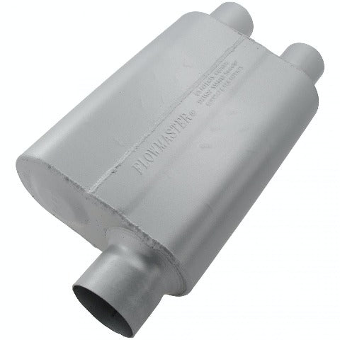This two chamber design incorporates Flowmaster's patented Delta Flow technology. The Delta deflectors generate increased scavenging for better performance and reduced interior sound. Milder exterior tone and reduced interior resonance over Original 40 series. Constructed of 16 gauge aluminized steel and fully MIG welded for maximum durability.