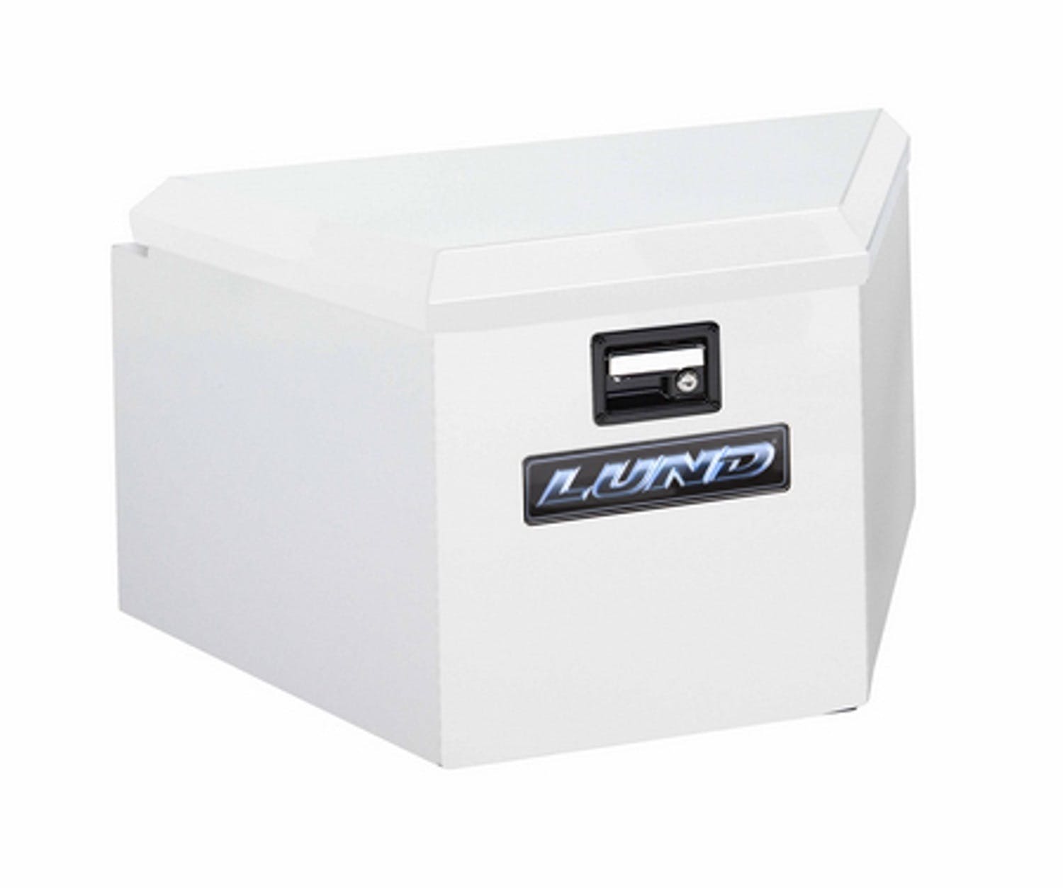 Trailer Tongue Boxes Constructed with heavy duty diamond tread aluminum, LUND's Trailer Tongue Boxes extend trailer usability by filling unused space with additional storage space for tools and equipment. These boxes are ideal for storing items such as: boat, personal water craft, equestrian, motorcycle and snowmobile accessories, as well as construction tools and equipment. The notched lids permit fully opening lids that can rest flush against trailer walls, allowing large items to easily be stored, while the strong 3 finger paddle handle offers easy single hand access. Each box features a secure locking double latch mechanism to ensure solid box closure, preventing accidental opening during transit, protecting expensive equipment and allowing application of padlocks.