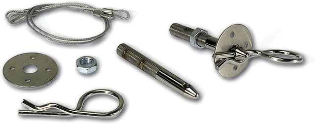 ; Compact and lightweight Hood Pin Sets consist of 3/8 dia. chrome plated steel pins with clips, 1-1/2 dia. stainless steel scuff plates and vinyl-coated stainless steel lanyards; Available in 3 and 4 pin lengths; Ideal for any full-bodied race cars; Two per set