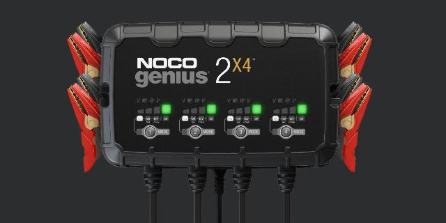 The Genius2X2 is a 6-volt and 12-volt, 4-Bank, 8-Amp Battery Charger, Battery Maintainer, and Battery Desulfator for all types of lead-acid and lithium-ion batteries, including flood, gel, and AGM, as well as marine and deep-cycle batteries. Similar to the G4, just better. It's 40% smaller and delivers 140% more power. A 4-bank battery charger maintainer rated a 8-amps - 2-amps per bank with a 40Ah capacity range - designed to charge and maintain multiple vehicles like cars, motorcycyles, boats, ATVs, RVs, lawnmowers, lawn tractors, trucks and more. An integrated thermal sensor detects the ambient temperature and alters the charge to eliminate over-charging in hot climates and under-chargeing in cold climates. it's not just a trickle charger, it's an advanced battery maintainer. A fully automatic, worry-free battery charger for everyday use- 24/7 - with zero overcharge.