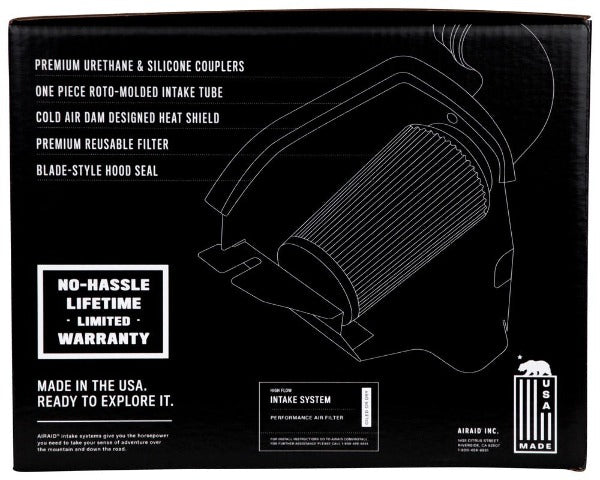 The AIRAID Jr. Kit targets the restrictive elements of factory intake systems, the intake tube and the paper filter, in order to help boost horsepower and mileage. This air intake kit offers a simple, economical introduction into the performance aftermarket with the introduction of an AIRAID Premium Direct-Fit Replacement Filter and an AIRAID Modular Intake Tube. As with other AIRAID intake systems, the AIRAID Jr. Kit helps to straighten and improve clean air flow to the engine for added throttle response and increased horsepower and torque. Each kit is custom made to fit specific vehicles and is easy to install and requires no drilling. Unlike stock paper filters, AIRAID Direct-Fit Replacement Filters are washable, reusable and fully backed by the AIRAID No-Hassle Lifetime Warranty. Some AIRAID air intakes are not legal for sale or use in California and other states adopting California emission standards, while others are 50 state legal. View the product's vehicle applications to determine the legal status for each vehicle.