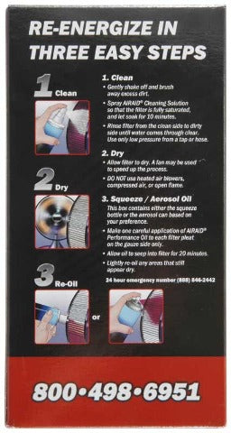The AIRAID Air Filter Renew Kit cleans and re-oils your AIRAID premium air filter. AIRAID Cleaning Solution is uniquely formulated to clean without damaging the gauze filter media. AIRAID Performance Oil is applied after cleaning and forms an additional line of defense against dirt without limiting airflow. Clean your AIRAID filter every 30,000 to 50,000 miles for normal driving, or more often for off-road and heavy dust conditions.