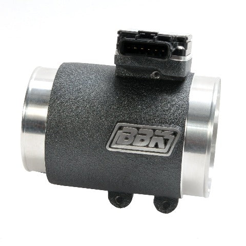 BBK Mass air flow meters MAF are a great choice for Mustang enthusiasts looking to improve airflow for increased performance or those who have upgraded to bigger fuel injectors. These BBK Mass Air flow sensors offer huge air flow increases over stock and can add up to an additional 15 rear wheel horsepower de on modifications. All BBK mass air meters are CNC Machined large bore aluminum housings with a custom BBK calibrated electronic sensor placed on top to accurately measure air flow for accurate air fuel ratios and maximum performance. Available with stock factory air box calibrations (FAB) or cold air kit calibrations (CAK) for 19lb, 24lb and 30lb fuel injectors. Please note Mustang Cobra require special order calibrated electronics.